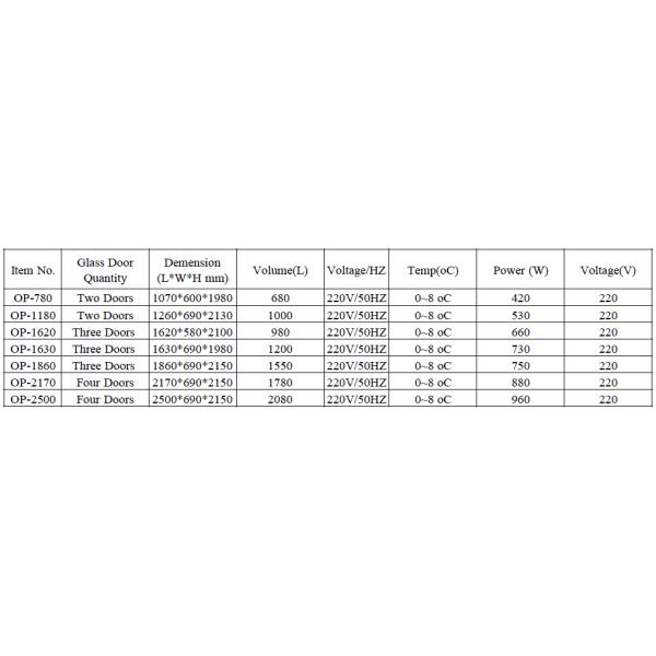 | OP-A412 | 2170*690*2150 | 2070*550*1570 | 1780L | 880W | 220V/50Hz | 0-10C |